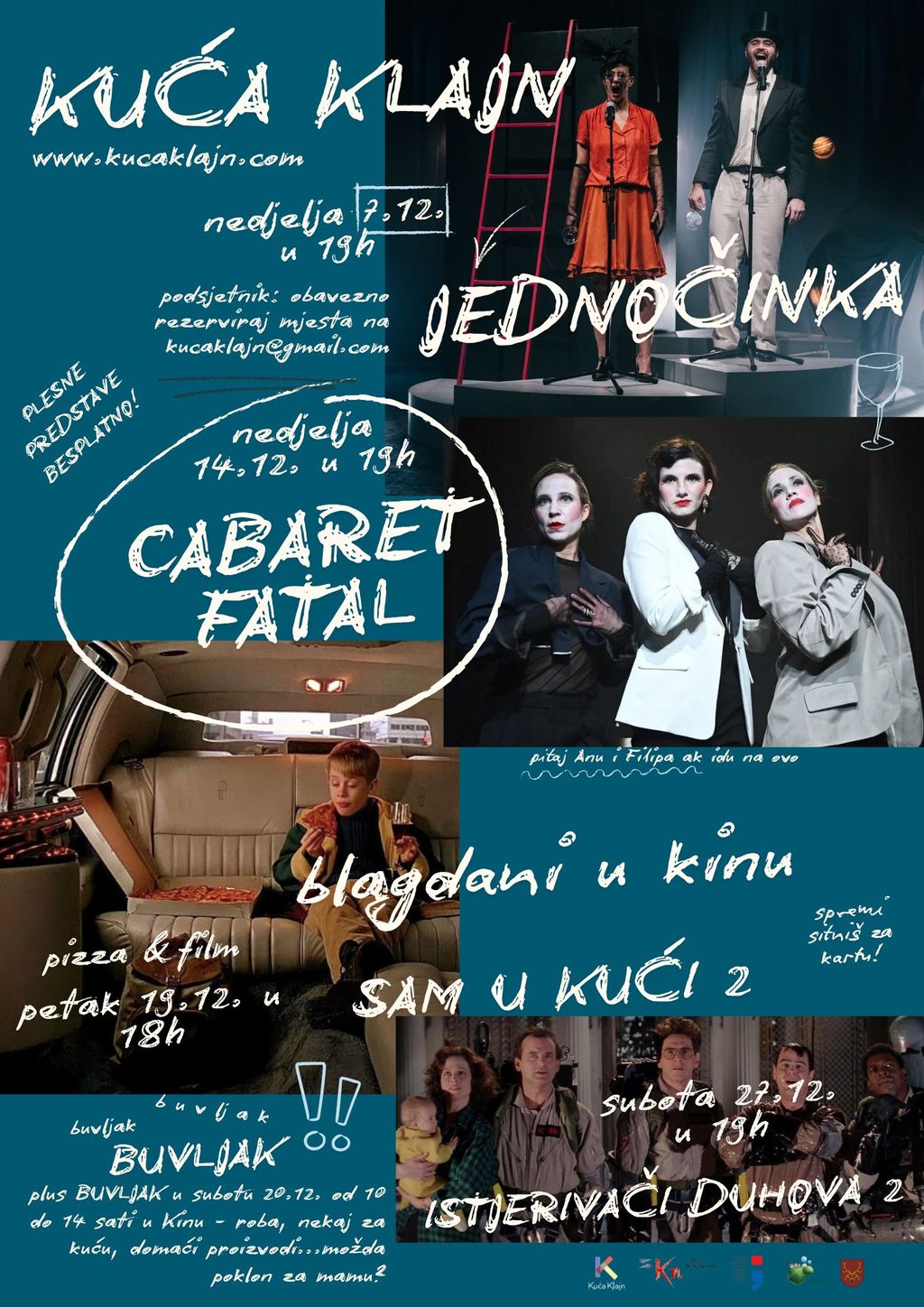 Program započinjemo plesnim predstavama JEDNOČINKA (7.12. u 19h) i CABARET FATAL (14.12. u 19h), a nastavljamo projekcijama filmova SAM U KUĆI 2 (19.12. u 18h) i ISTJERIVAČI DUHOVA 2 (27.12. u 19h).